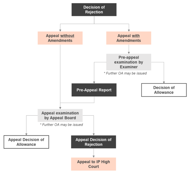 If you file no Amendments, the case directly goes to appeal examination, where the application is examined by the Appeal Board (three Appeal Examiners). The appeal outcome is either an Appeal Decision of Allowance or Rejection. If an Appeal Decision of Rejection is issued, the applicant can file an appeal to the IP High Court, but Amendments cannot be filed.