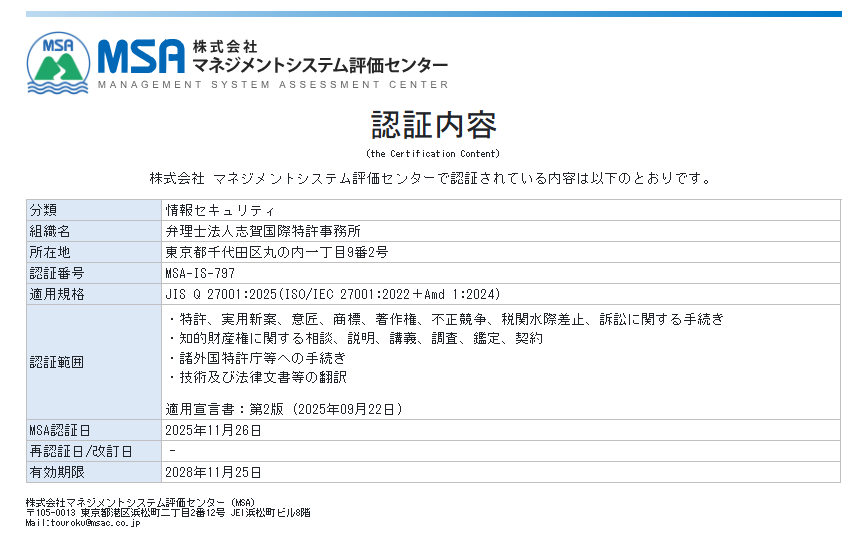2025年12月01日 事務所ニュース ISMS(ISO27001)認証を取得しました 2025年11月26日、弁理士法人志賀国際特許事務所はISO27001(ISMS 認証)を取得したことをご報告申し上げます。
