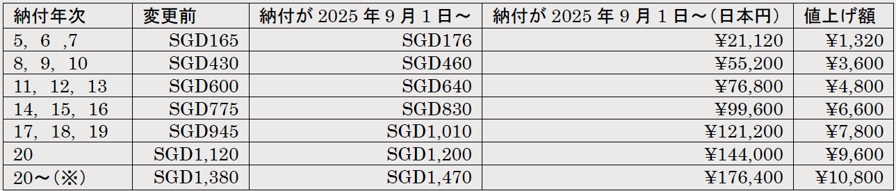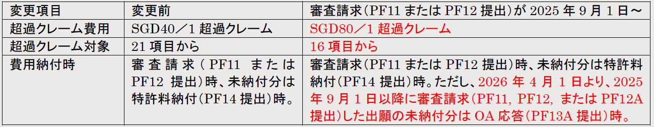 審査報告書(第29条(4))、調査・審査報告書(第29条(5))、および補充審査報告書(第29条(6))、に対する再審査の請求(PF12B)の費用が、変更前のSGD1,420(\170,400)から、2025年9月1日よりSGD2,150(\258,000)、2026年4月1日よりSGD3,200(\384,000)と2段階で値上げされます。