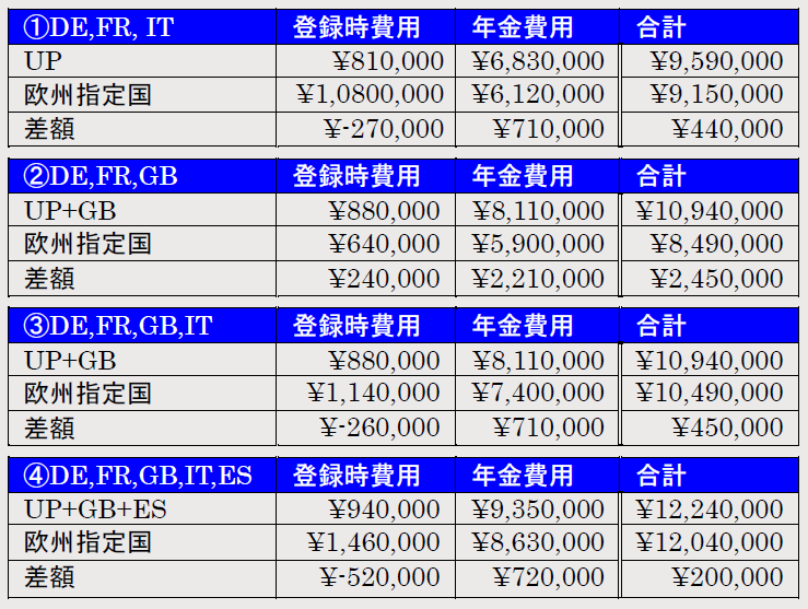 - UPを利用する場合とUPを利用しない(各指定国として権利取得する)場合の比較