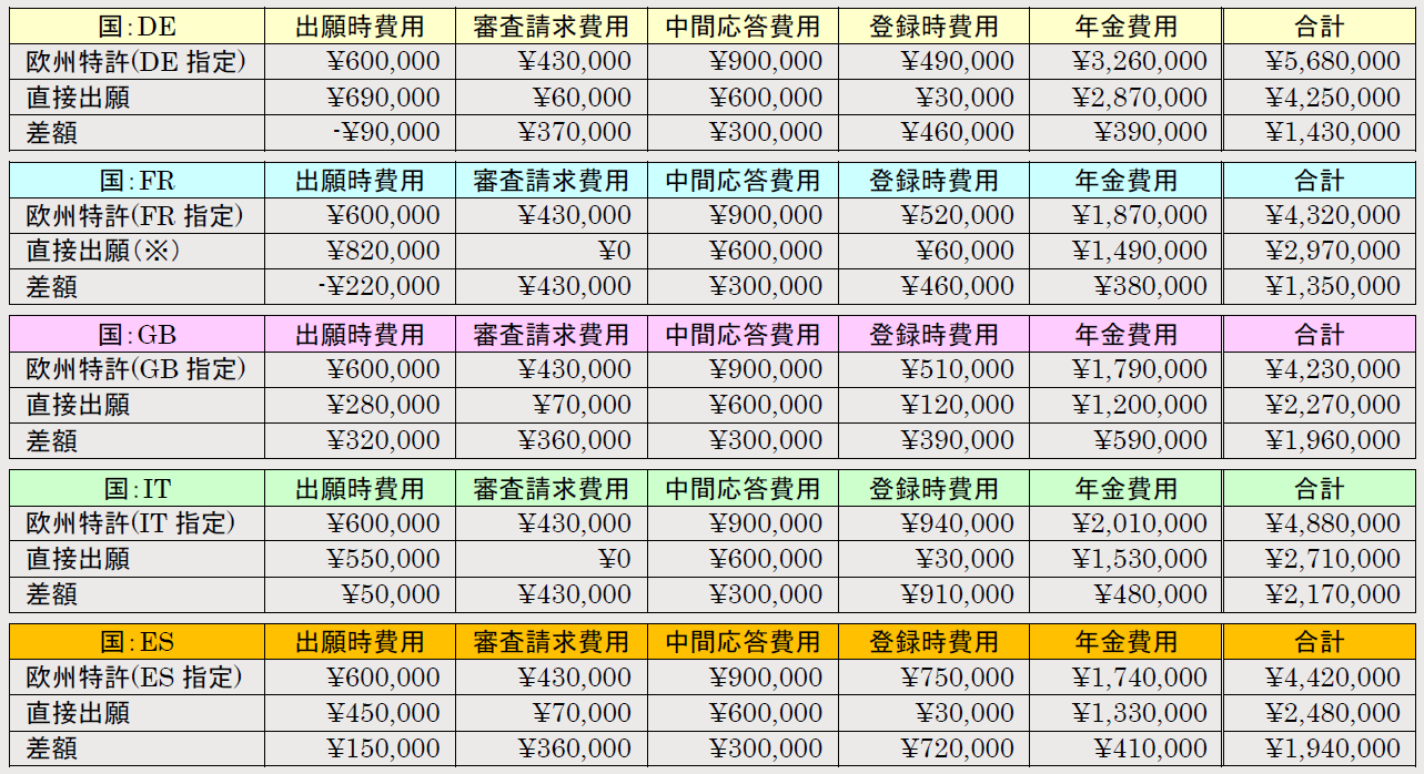 - 欧州特許の指定国として権利取得する場合とその国に直接出願して権利取得する場合の比較