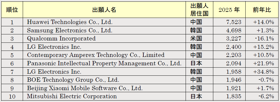 前年と比べて順位に大きな変動はありませんが、シンガポールが15位に初ランクインしました。目立つ点は、前年に続いてフィンランドが大きく増加し、これに対して、毎年増加傾向のインドが大きく減少した点です。WIPOの統計データに基づき各国における2025年の上位3技術分野の状況を併記しました。フィンランドはデジタル通信分野において400件近く増加しました。これは後述の上位出願人ランク外だったものの、前年より470件増加の同国通信機器大手Nokia Technologies OY(全体で15位)の躍進が大きく影響しています。