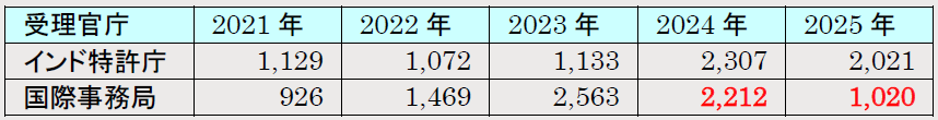 インドは上位3技術分野において前年より大きく伸びましたが、全体の出願件数は1,500件近く減少しました。インド政府がPCT出願啓発プログラムを全国展開し、スタートアップ、中小企業、大学などがPCT出願件数を増やしていますが、このグループが特許出願に対する研鑽を積み、費用対効果の高い選択肢としてインド国内特許のみ、外国はパリルートで欧米のみ権利化する傾向にあるという情報があります。また、受理官庁別では、インド特許庁と国際事務局とで後者が半分以上減少しました。国際事務局よりも、手数料減額措置を講じているインド特許庁を利用する出願人が増えているようです。一方、2025年のインド国内出願が大幅増加したため2026年のPCT出願件数も増加を期待でき、今回の減少は一時的だとする指摘もあります。今後の動向に注目してまいります。
