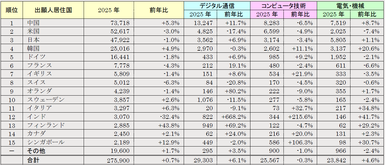 2025年のPCT出願の総出願件数は、暫定で275,900件と発表されました。これは前年(273,913件)比で0.7%の増加となりました。